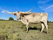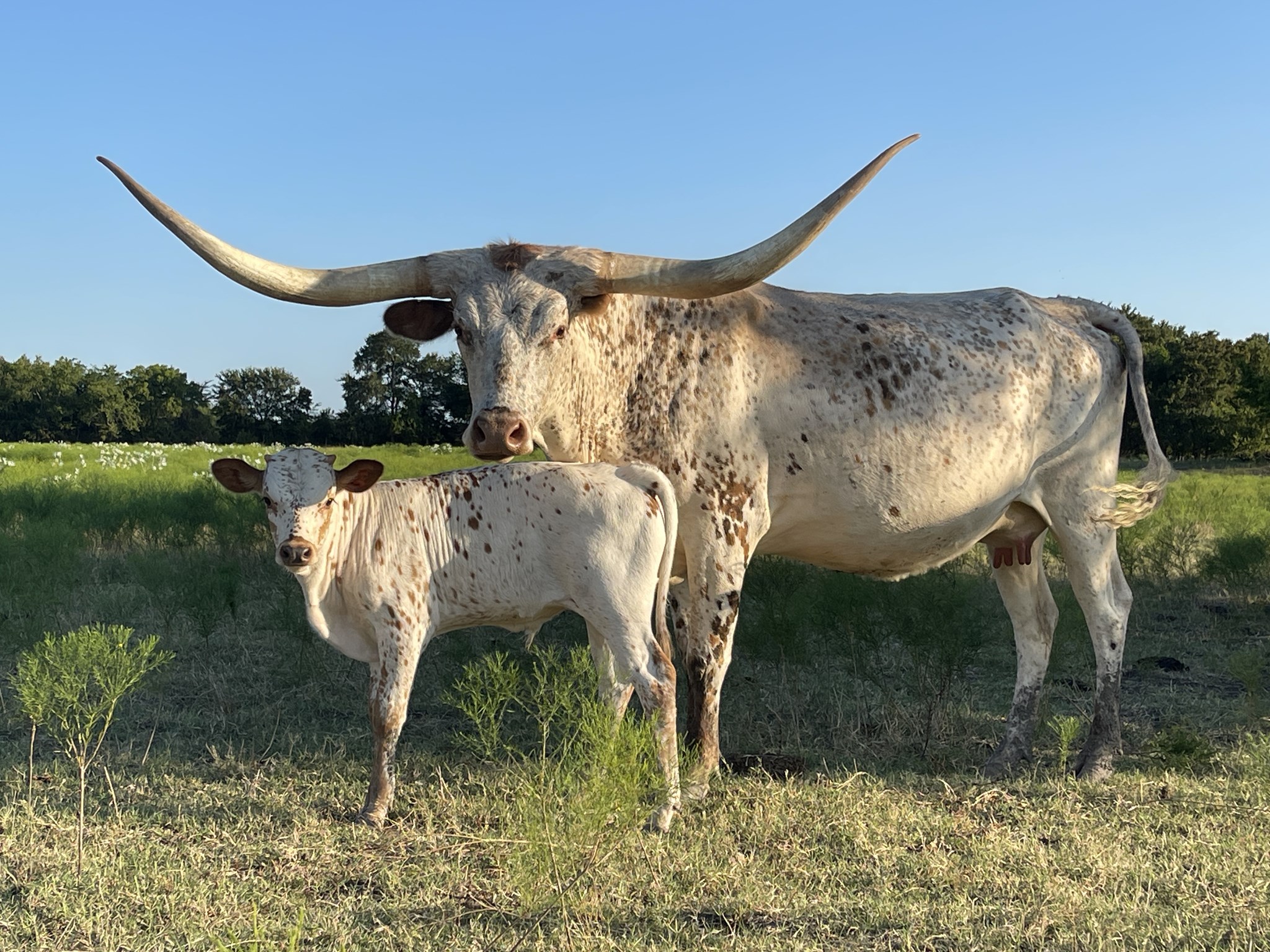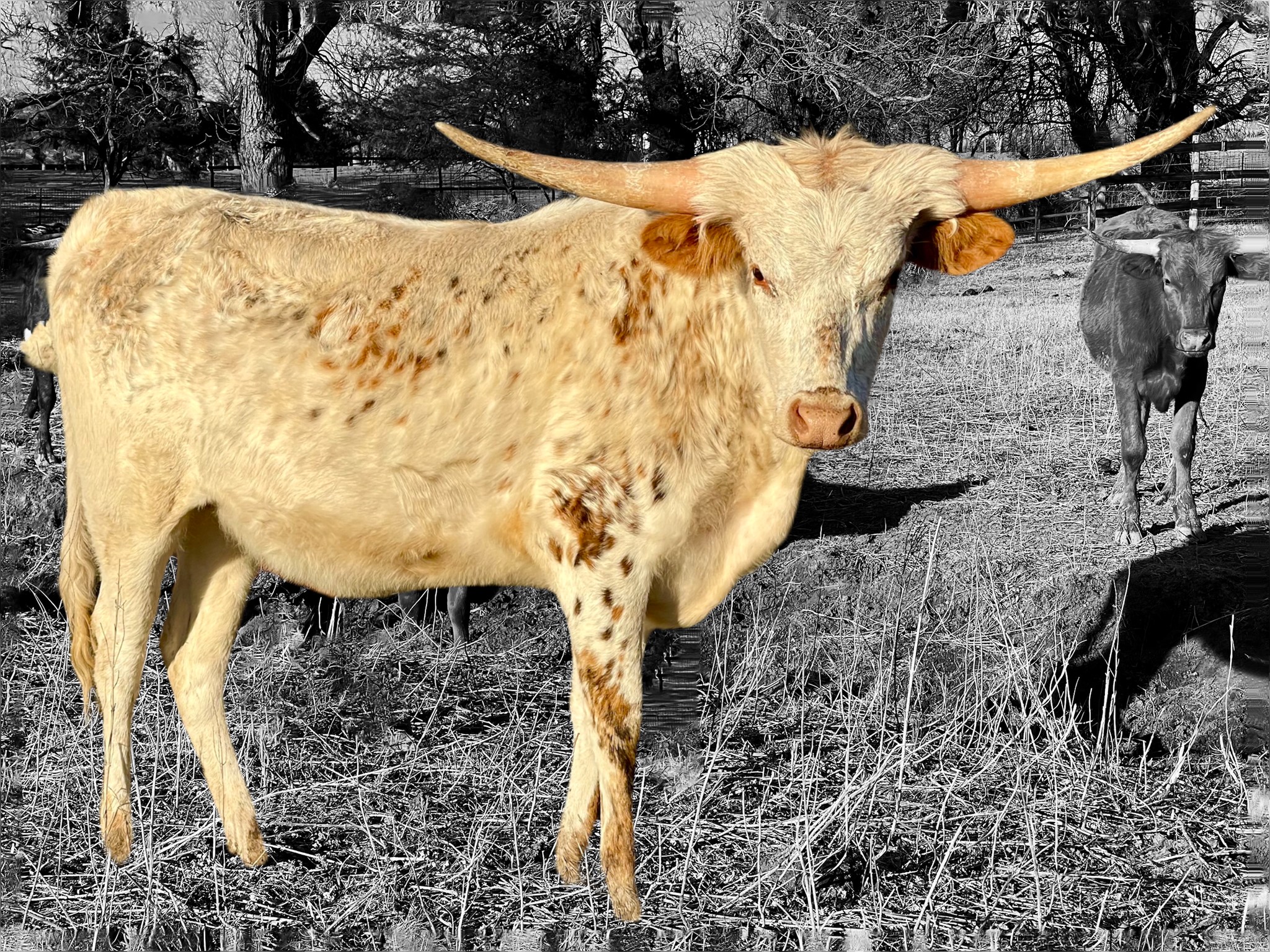 This cow is definitely not one of the biggest horned daughters sired by the great Rebel HR, but her maternal line has proven producers of over 100" offspring! Her dam is a full sister to BL Rio Catchit, dam of Tuff Chex. She is still young, we just haven't hit that magic cross on her yet. Her color is hard to capture in a photo, but she is speckled brindle all over. Let her go to work with your good bull, or AI her to fast track her production!