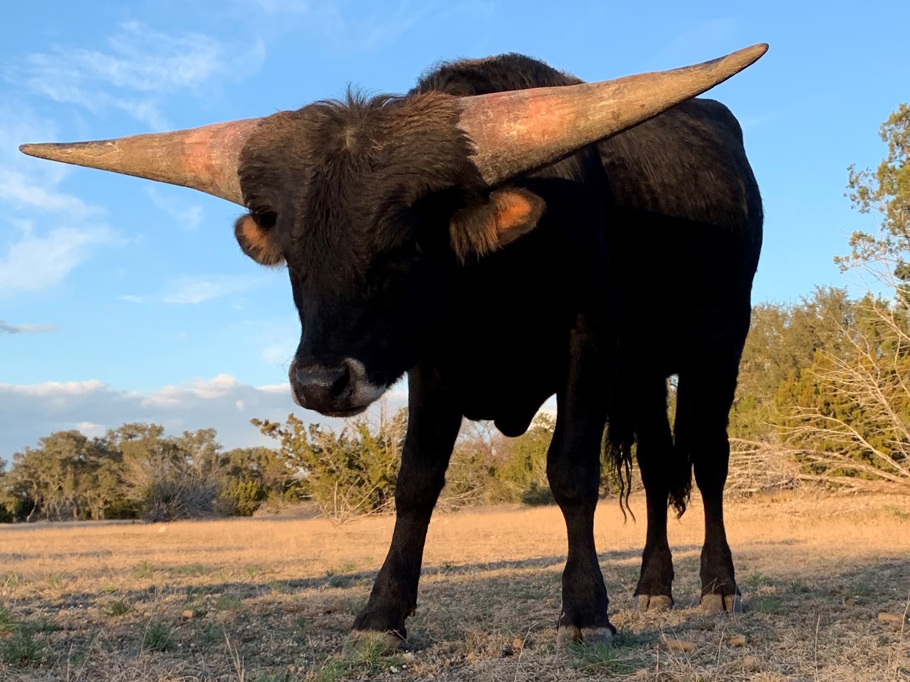 Gorgeous Parker Brown bull that was 41.065" TTT on his 1st birthday. He's putting the color and horn on his offspring as well! All of his calves to date have either gone Parker or Brindle with 1 being a True Black. His large bases are balancing with his body as he fills out. Click on his Progeny tab!